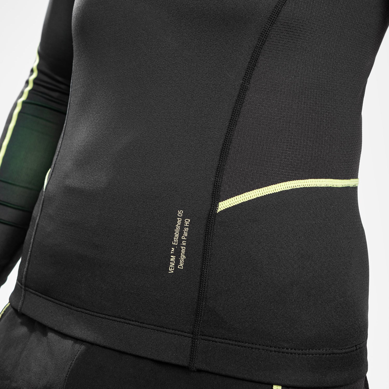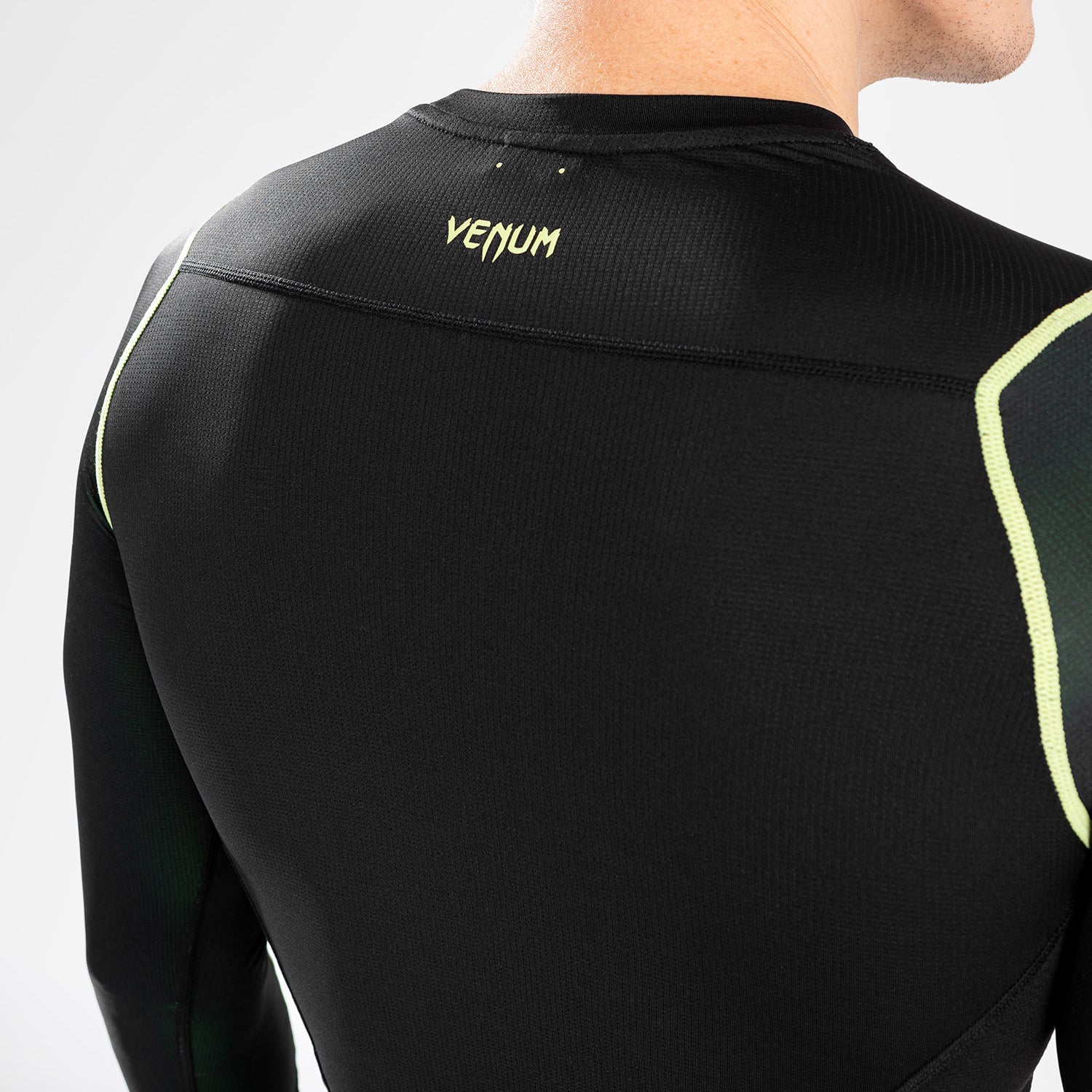 Contrasterende neongeel gekleurde biezen en Venum logo's voegen levendige energie toe aan je stijl.