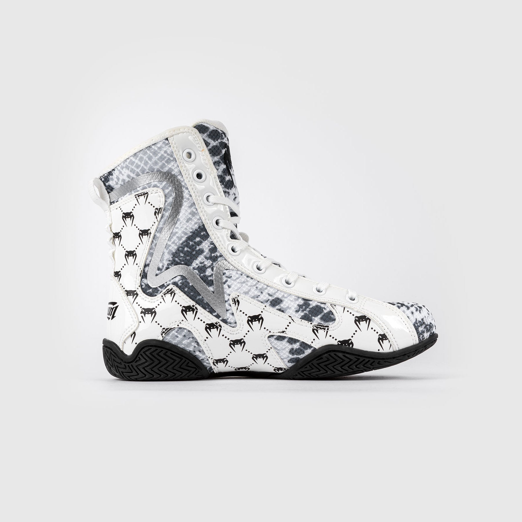 De Venum White Snake-boksschoenen zijn gebaseerd op Venum's best verkopende Elite Evo Monogram-model, dat samen met professionele vechters is ontwikkeld. Deze lichtgewicht maar toch ondersteunende schoen is ideaal voor boksers van alle niveaus.